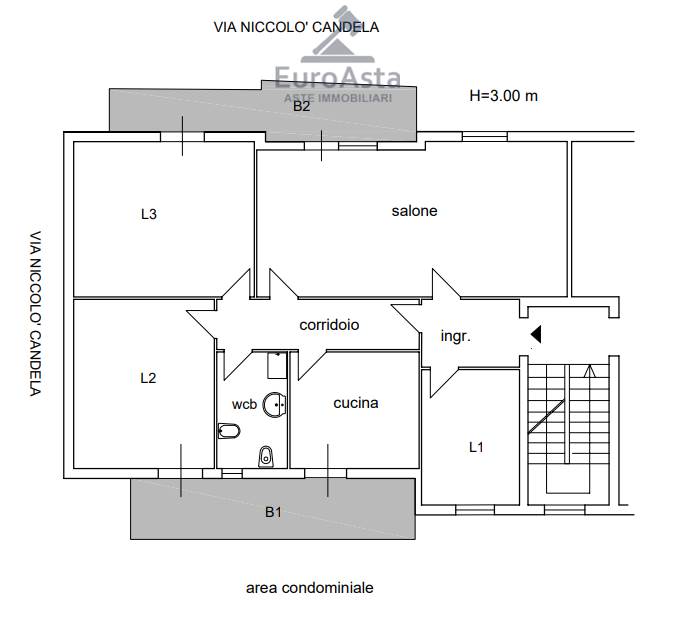 Appartamento di civile abitazione sito in Palermo via Niccolò Candela n.14, posto al piano primo a sinistra salendo le scale. L’appartamento è composto da salone pari a due vani, 3 camere, wc bagno, cucina abitabile, 2 balconi rispettivamente sui fronti nord e sud. L’immobile è identificato al C. F. del Comune di Palermo, al foglio 28, particella 734, sub. 5, cat. A/3, consistenza 5,5 vani, superficie catastale totale 121 mq, totale escluse aree scoperte 114 mq, rendita euro 267,01