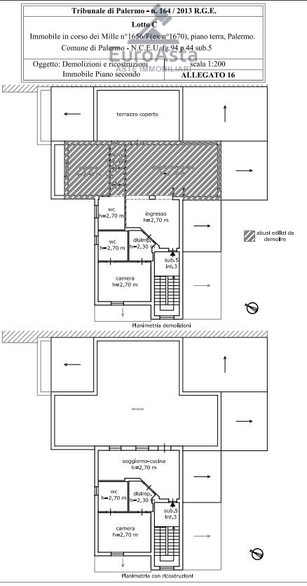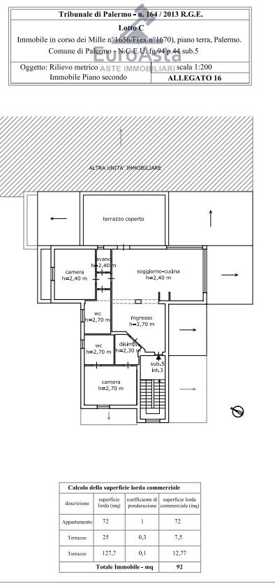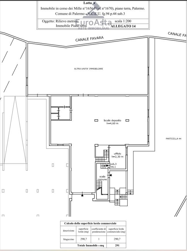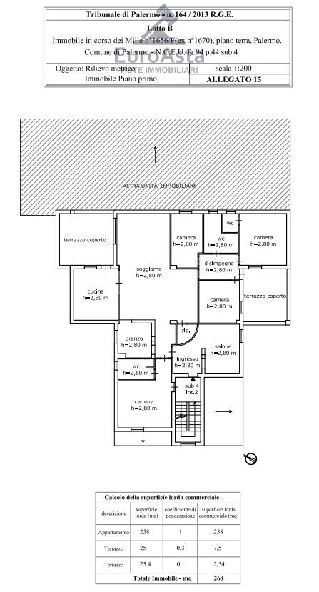 Fabbricato per civile abitazione sito in Palermo, Corso dei Mille n. 1656/F (già n. 1670), sì composto: magazzino al piano terra, interno 1, costituito da un grande vano deposito, con locali accessori e un locale ufficio, avente una superficie di circa 291 mq, con ingresso dall'area esterna e dalla scala interna comune, identificato in Catasto Fabbricati del Comune di Palermo al foglio 94, particella 44, subalterno 3, Categoria C/2, Classe 7, Consistenza 265 mq, Rendita € 396,90, corso dei Mille n. 1670 (oggi civico n.1656/F), piano T, interno 1, contraddistinto in CTU come LOTTO A; appartamento al piano primo, interno 2, con accesso dal vano scala comune a tutto il fabbricato, composto da nove vani e tre servizi igienici, avente una superficie di circa 268 mq., identificato in Catasto Fabbricati del Comune di Palermo al foglio 94, particella 44, subalterno 4, Categoria A/7, Classe 6, Consistenza 11 vani, Rendita € 1.136,90, corso dei Mille n. 1670 (oggi civico n.1656/F), piano 1, interno 2, contraddistinto in CTU come LOTTO B; appartamento al piano secondo, interno 3, con accesso dal vano scala comune a tutto il fabbricato, composto da cinque vani, due servizi igienici e lavanderia, avente una superficie di circa 140 mq., identificato in Catasto Fabbricati del Comune di Palermo al foglio 94, particella 44, subalterno 5, Categoria A/7, Classe 6, Consistenza 3,5 vani, Rendita € 361,52, corso dei Mille n. 1670 (oggi civico n.1656/F), piano 2, interno 3, contraddistinto in CTU come LOTTO C; visto l’art. 2912 c.c. e 569 c.p.c., sono compresi nel LOTTO 1 oggetto di vendita, i cespiti pertinenziali “comuni non censibili” quali la corte comune censita in C.F. di detto Comune al foglio 94,