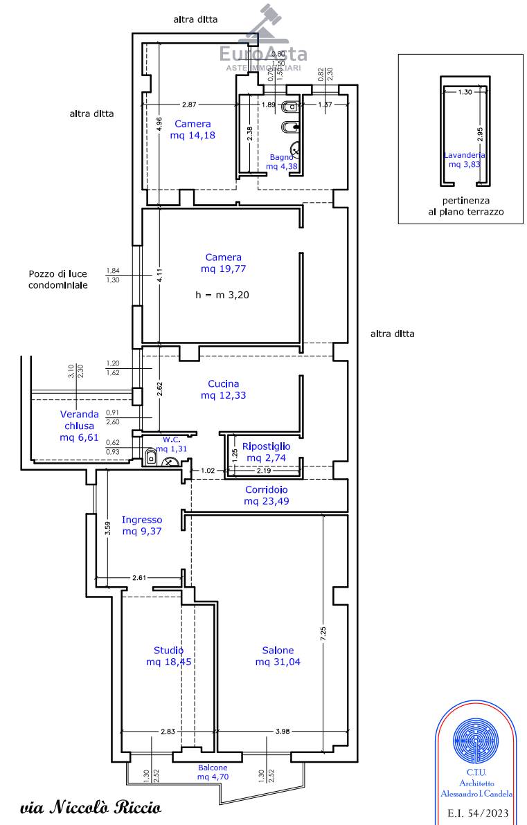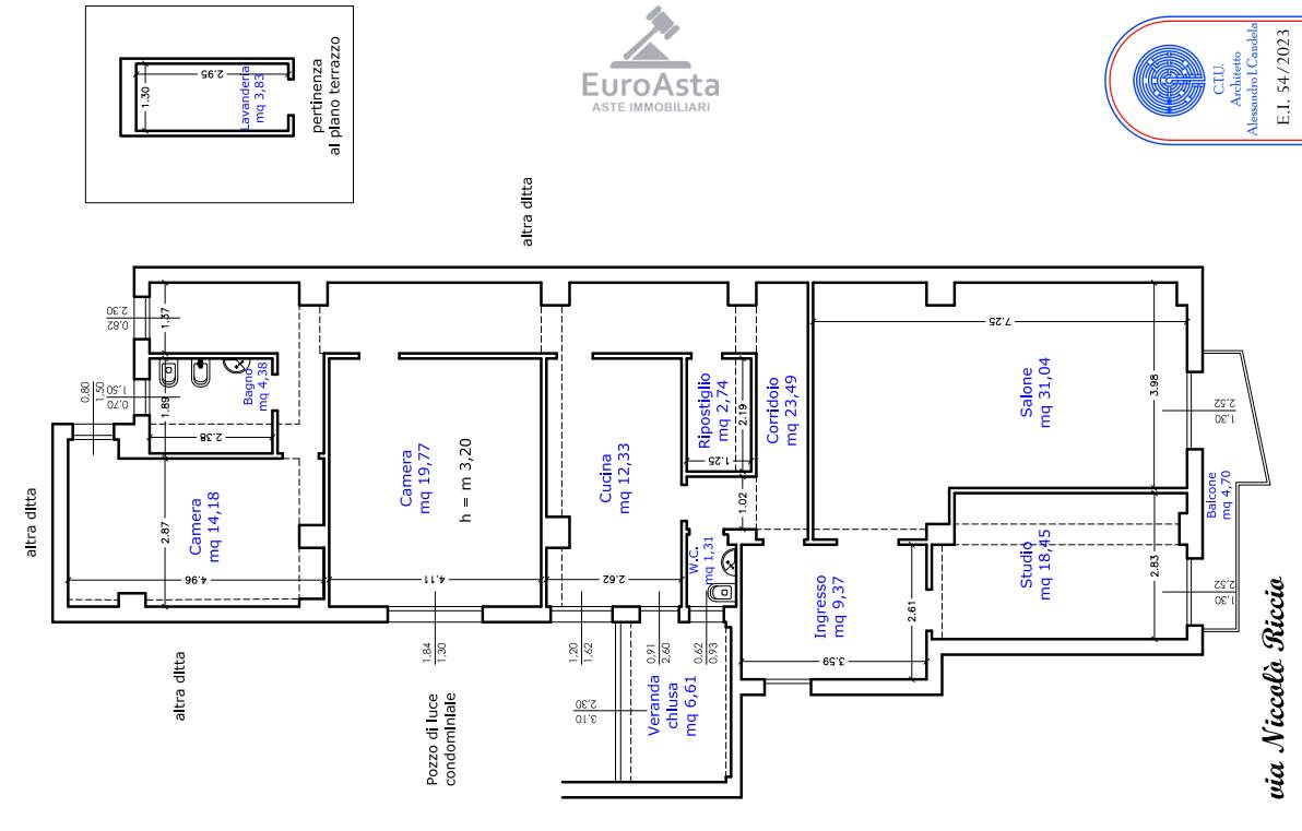 Appartamento posto al 4 piano con ascensore di mq 150, vani 8 L'appartamento, raggiungibile dal vano scala munito di ascensore, ha una superficie utile complessiva di circa mq. 137,06. L'unità immobiliare risulta così distribuita: ingresso, salone, studio, due camere, una cucina dalla quale si può accedere ad una veranda chiusa di circa mq. 6,61, bagno, wc, riposto, corridoio, balcone prospiciente la via Nicolò Riccio. Pertinenza dell'appartamento è una lavanderia di circa mq 3,83 posta al piano terrazzo.