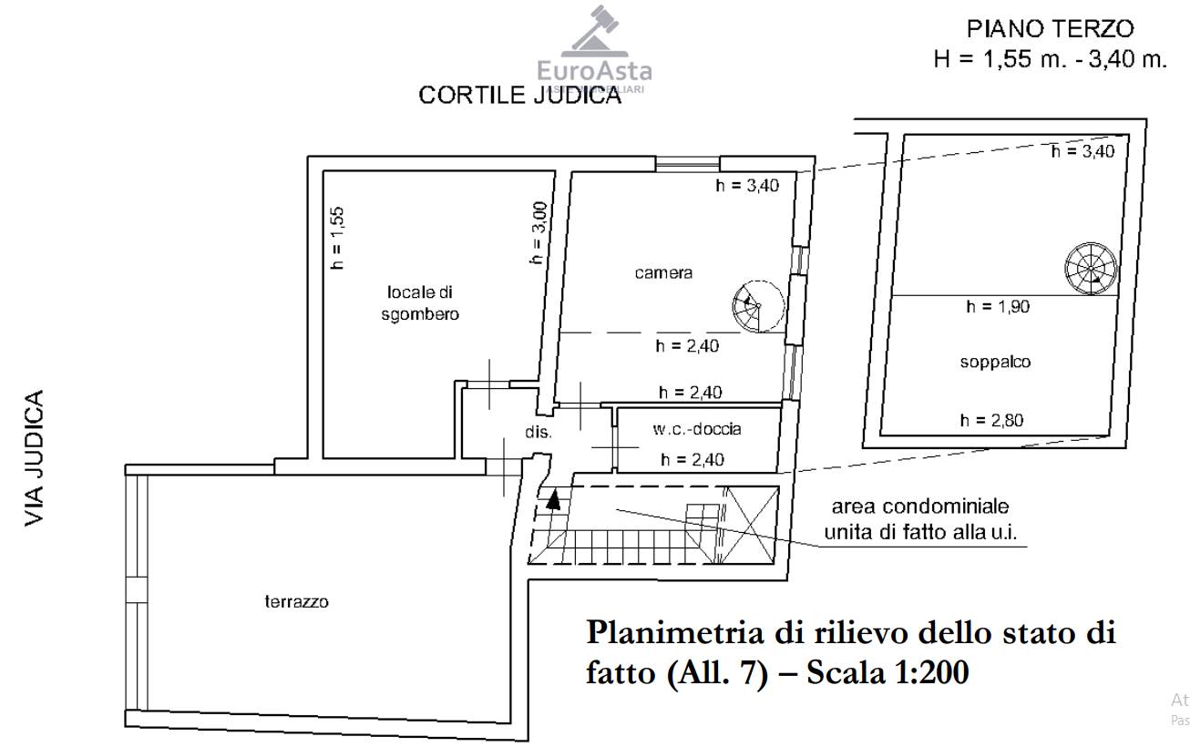 Appartamento composto da: ingresso, tre camere, cucina-soggiorno, w.c.-bagno, ripostiglio e disimpegno, a piano secondo, e da una camera con soppalco, w.c.-doccia, disimpegno, locale di sgombero e terrazzo, a piano terzo, per complessivi 8,5 vani catastali